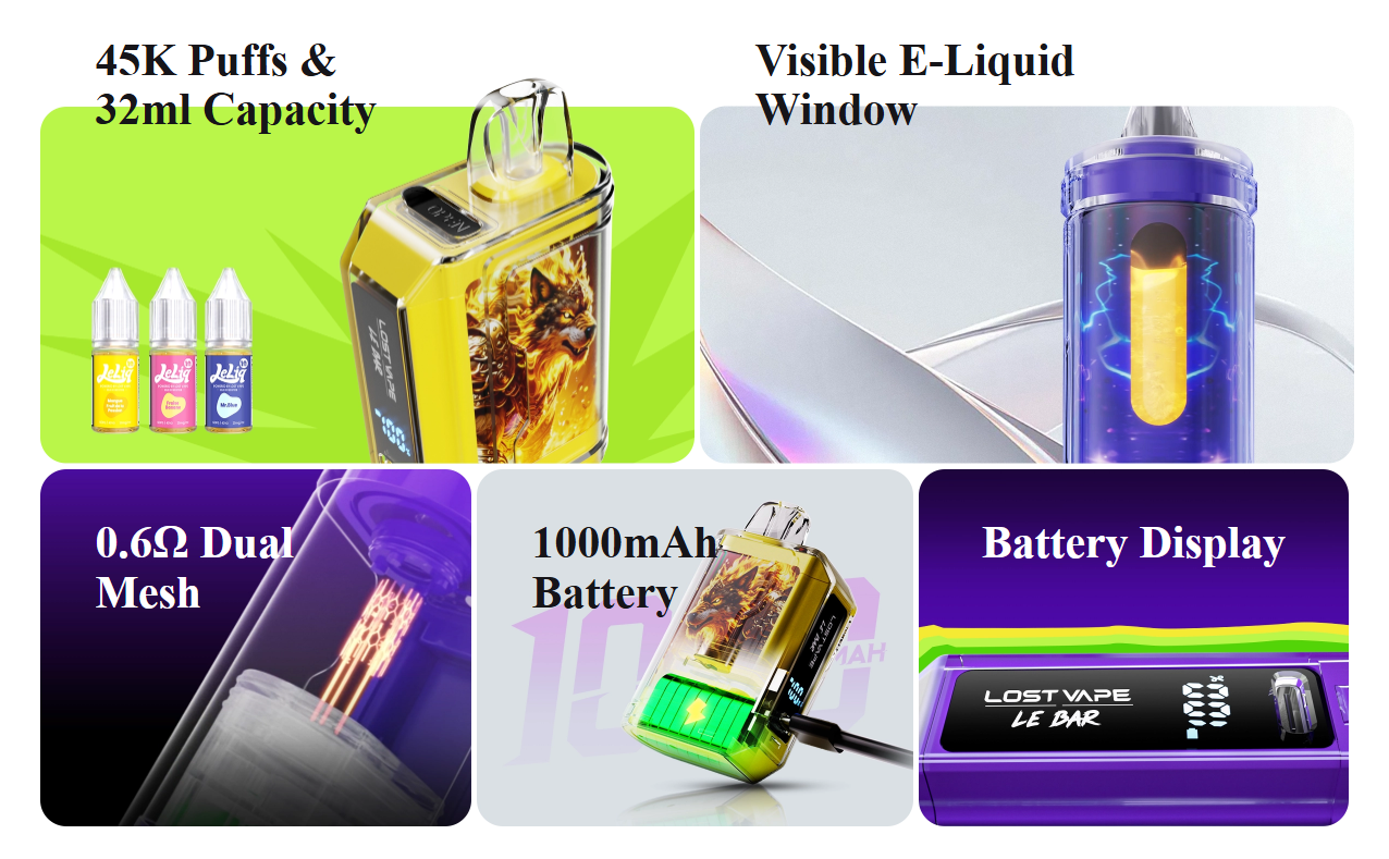 The LE Bar 45K takes a different route with its refillable design. Instead of one large internal tank, it includes a 2mL built-in tank plus three separate 10mL e-liquid bottles. The visible e-liquid window lets you monitor juice levels without relying on digital displays. With its anime and animal-themed designs across 10 flavor options, the 45K wears its personality on the outside. The 1000mAh battery matches the 40K’s top-end capacity, and both use USB-C fast charging.