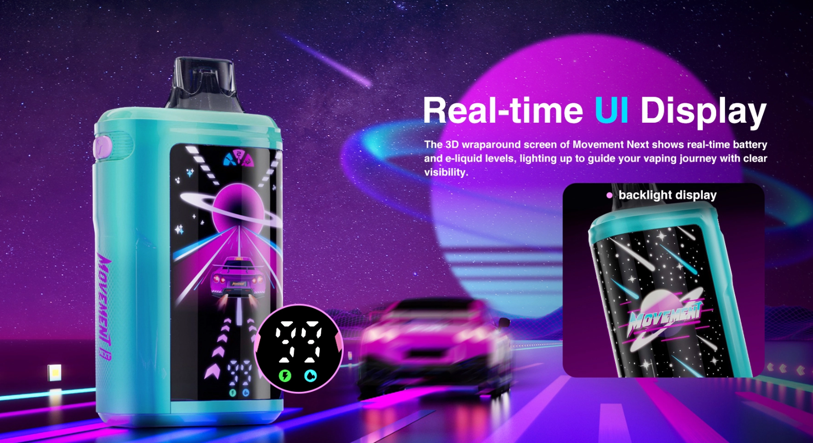 The Lost Vape Movement NEXT 30K turns heads with a design that’s anything but subtle. Its boldest visual cue? A massive wrap-around Mega HD screen that displays battery and e-juice levels. It’s like a smartwatch merged with a vape. The device feels substantial yet ergonomic, and the build is rugged enough to match its high-performance guts. It’s a clear statement piece—flashy, futuristic, and proud of it.