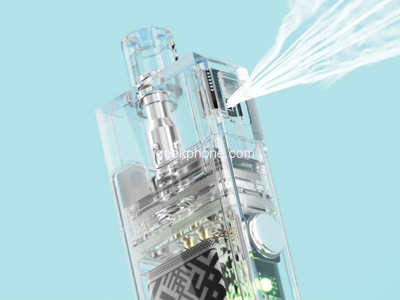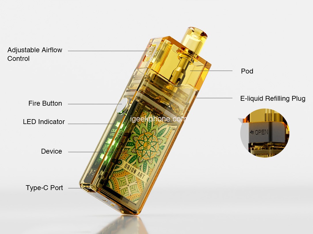 The Lost Vape Orion Art received an extravagant thermoplastic case with a strict rectangular silhouette and transparent walls that expose the insides. A removable magnetic cartridge with a large built-in mouthpiece and an air inlet equipped with a valve was placed on top. The narrow front side was equipped with a round ignition button and three bright indicators. The sides were decorated with decorative panels with various original ornaments. The range of colors included six options. For comfortable carrying, a lanyard with a removable ring is provided.
