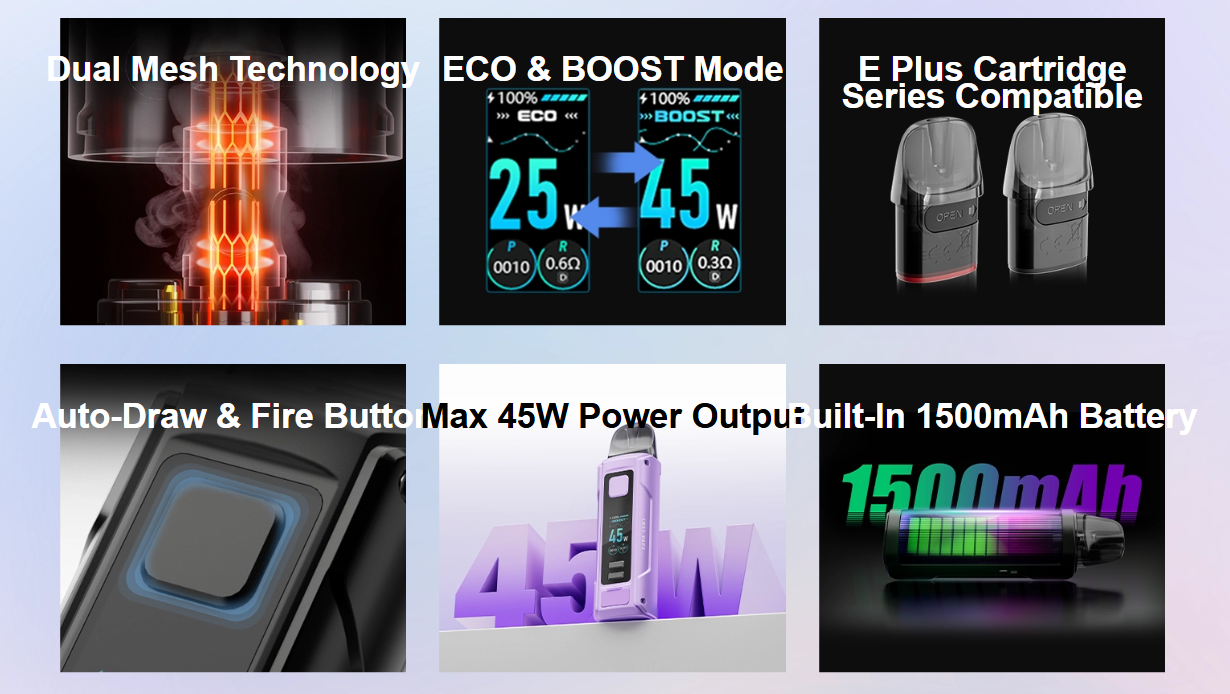 In contrast, the Thelema Nano pushes the boundaries of pod vaping with 45W max output, a 1500mAh battery, and Dual Mesh technology in the E Plus cartridges. The star of the show is its ECO & BOOST modes—ECO saves battery and coil life by firing only one mesh, while BOOST activates both coils for intense flavor and denser clouds. This makes it perfect for flavor chasers and vapers who prefer sub-ohm performance in a pod-sized format.