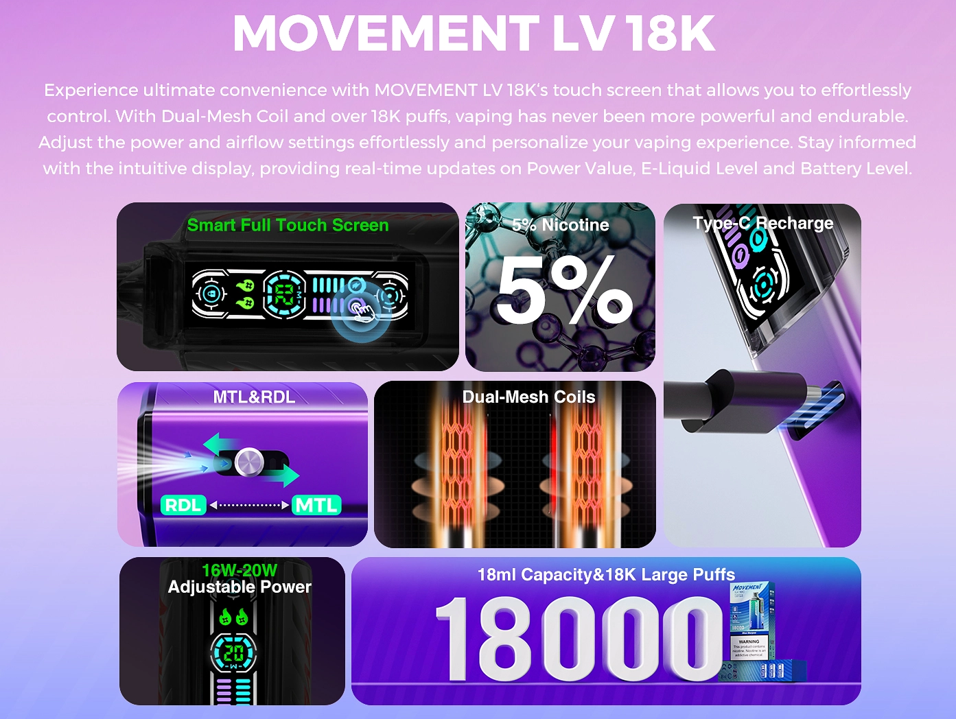 The Lost Vape Movement LV 18K Pod exhibits a cutting edge and ergonomic plan, making it outwardly engaging and agreeable to hold. The feature of the plan is the Brilliant Full Touch Screen, which adds a hint of refinement as well as gives consistent control readily available. The natural presentation offers continuous updates on Power Worth, E-Fluid Level, and Battery Level, keeping clients all around informed about their gadget.