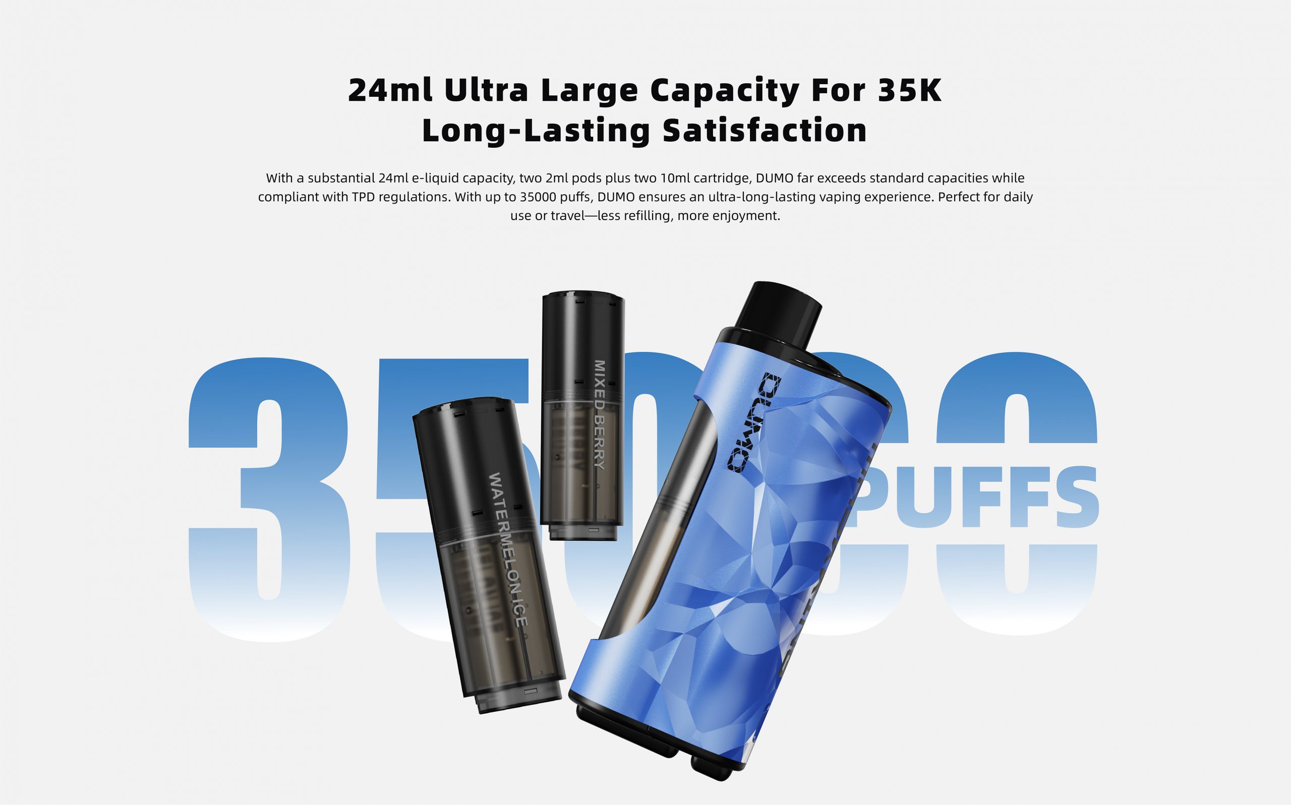 The MASKKING Dumo arrives as a standout contender in the disposable vape market, promising a fusion of power, versatility, and sleek aesthetics. The Dumo is compact enough for pocket carry yet substantial in its feature set. Its most eye-catching promise is an ultra-large 24 ml e-liquid capacity, engineered for up to 35,000 puffs, ensuring that even the most voracious vapers can go days—or even weeks—between refills. With dual-flavor capability, a transparent tank, a smart battery readout, and a thoughtfully textured finish, the Dumo stakes its claim as a top choice for vapers seeking both longevity and style.