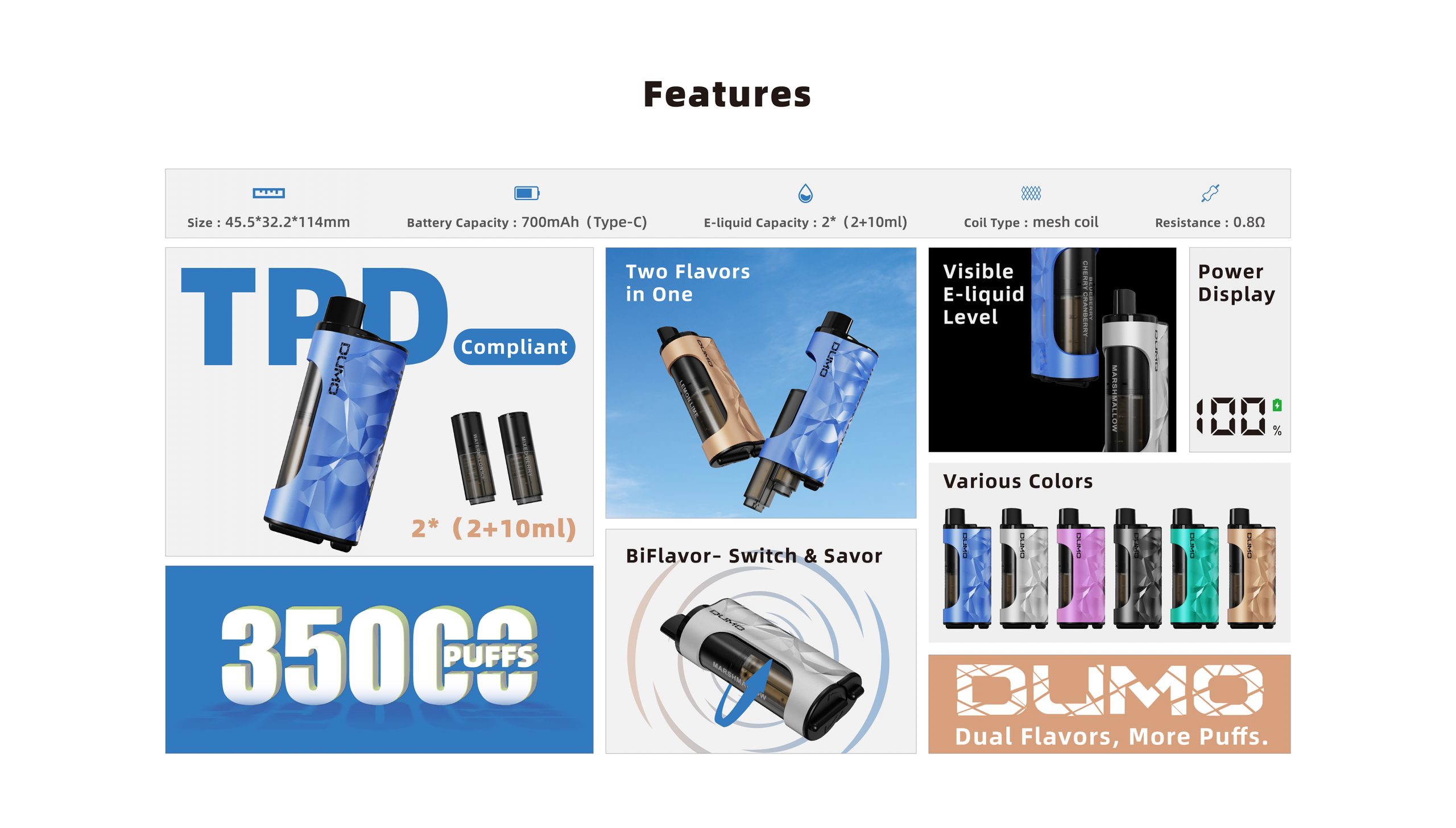 One of Dumo’s most innovative ideas is its twist-to-switch mechanism, which lets you alternate between two flavors on the fly. Whether you crave a cool mint after a rich tobacco or a fruity blend to cap off the day, the transition is immediate and seamless, banishing flavor fatigue. -
