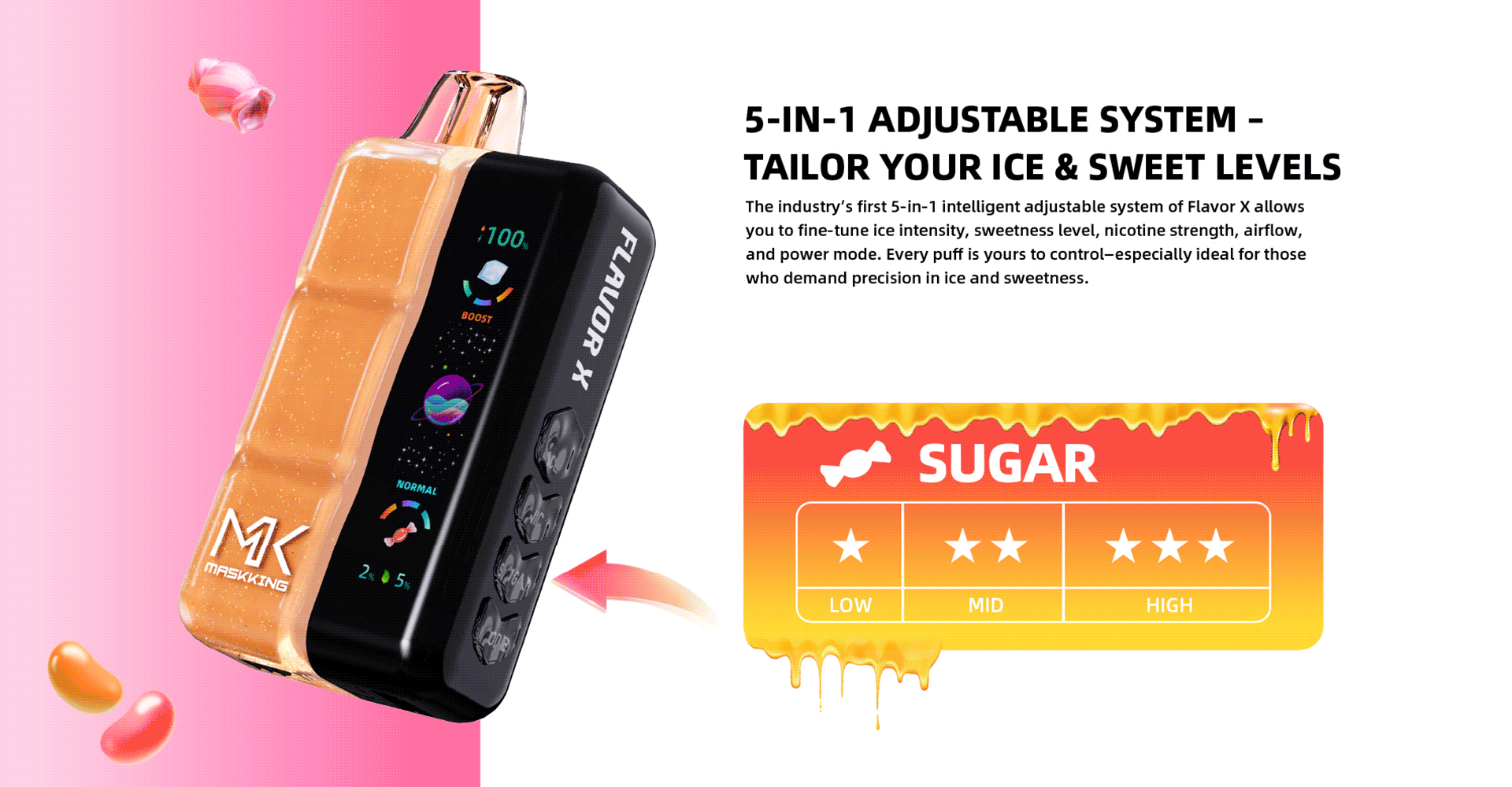 The Maskking Flavor X 50K introduces a 5-in-1 adjustable system, allowing users to fine-tune their vaping style — from tighter flavor draws to airy, cloud-heavy sessions. It’s designed for versatility, making it perfect for both flavor chasers and cloud enthusiasts. Its advanced mesh coil ensures rich flavor and smooth vapor throughout all 50,000 puffs, powered by a reliable 850mAh rechargeable battery with Type-C fast charging.