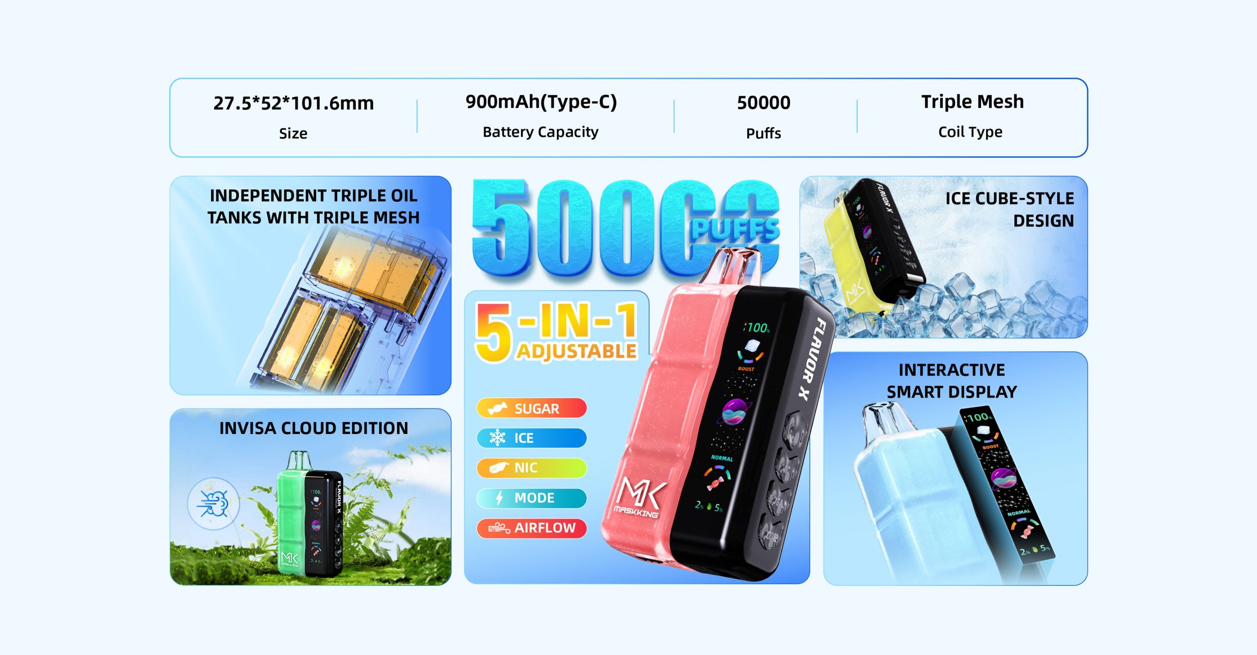 • Choose Maskking Flavor X 50K if you value flavor diversity, customization, and smooth consistency in a compact form. Its 5-in-1 system and massive flavor selection make it one of the most user-friendly premium disposables on the market.