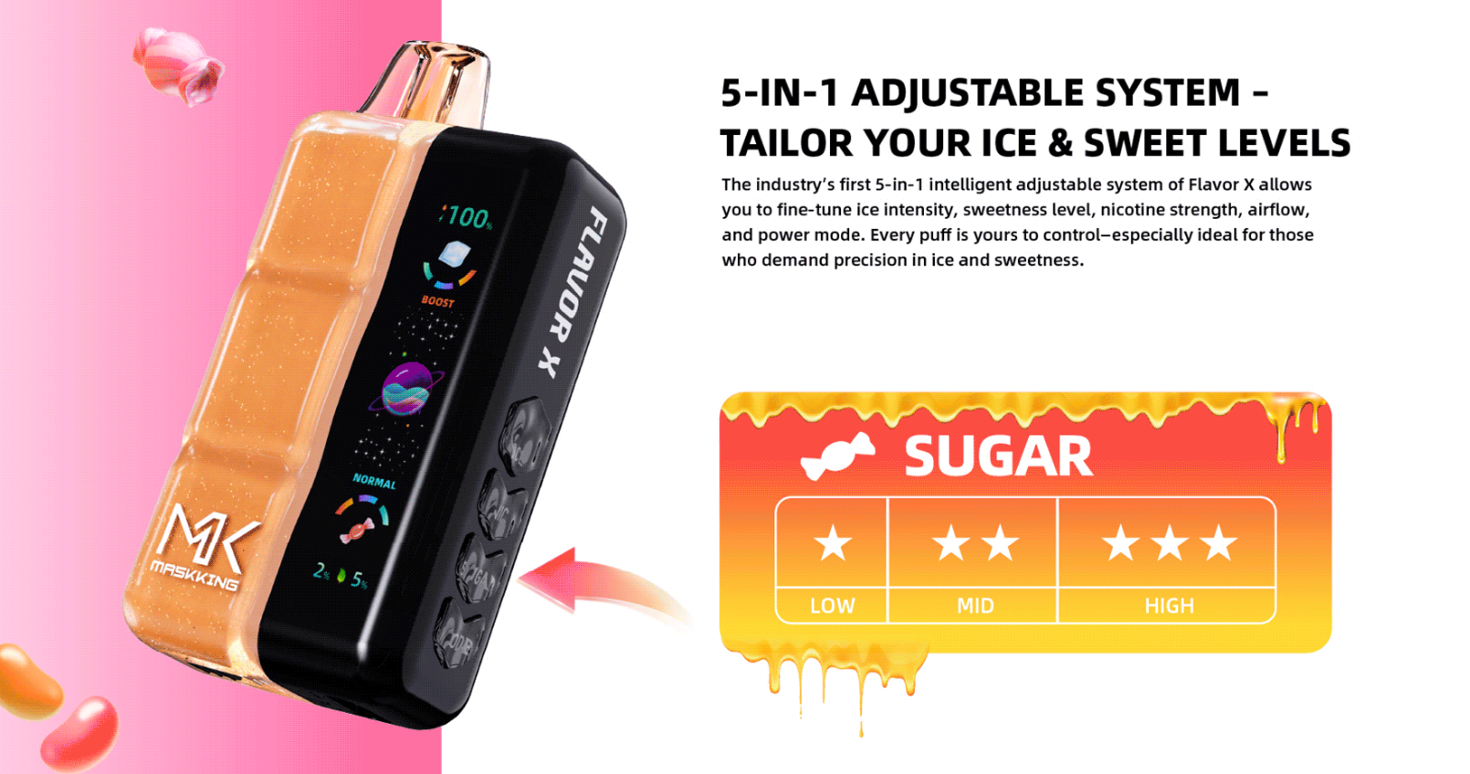 Maskking Flavor X comes loaded with features for versatility. With up to 50,000 puffs, three distinct vaping modes (Low/Med/High), and adjustable airflow that caters to both MTL (mouth-to-lung) and RDTL (restricted direct-to-lung) styles, it’s designed for users who like to experiment. The dual mesh coil ensures stronger flavor delivery, and the large 850mAh rechargeable battery pairs with USB-C for convenient recharges. The smart LED screen also makes tracking battery and puff info straightforward.