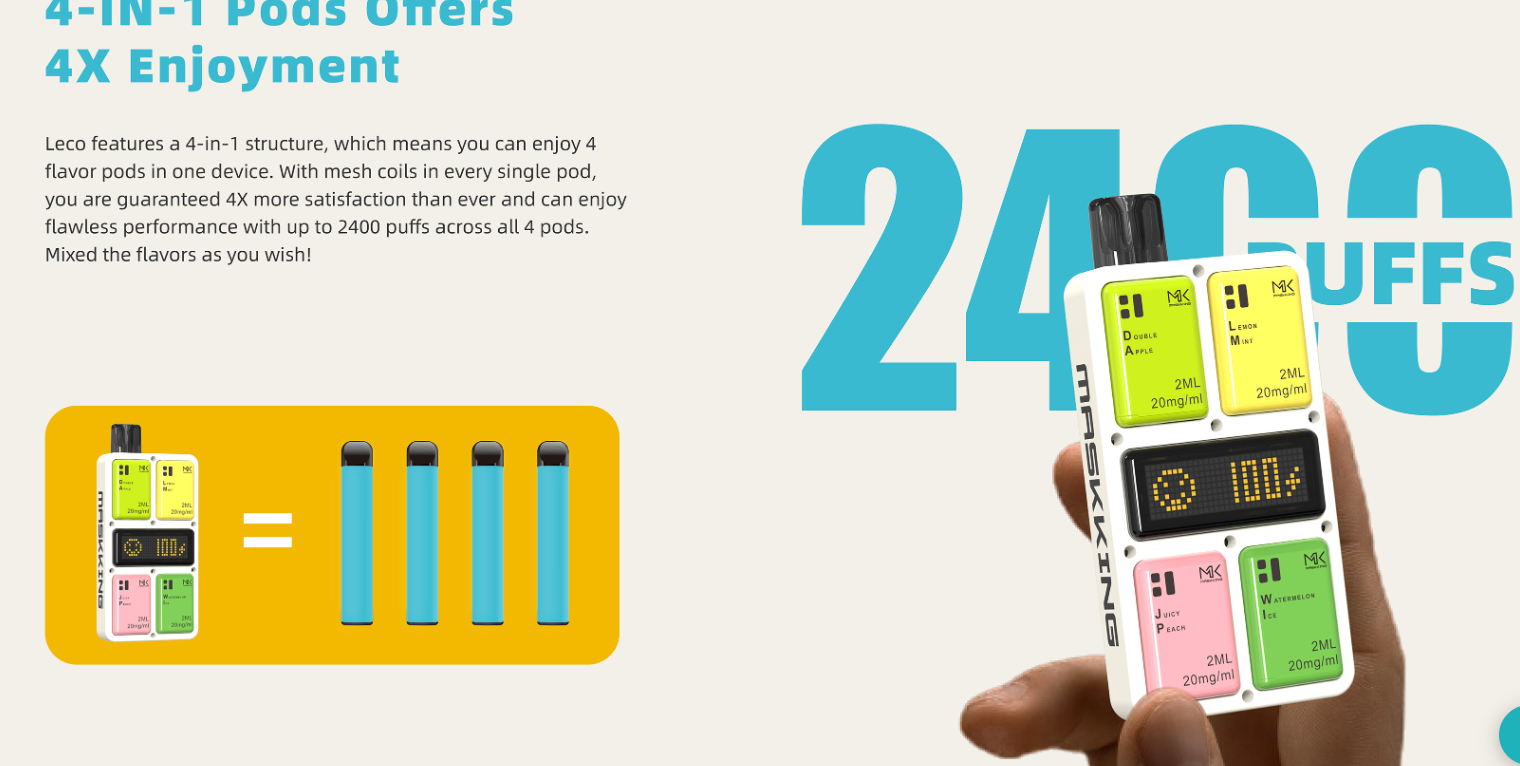 The Maskking Leco 4-in-1 Pod is a standout in the world of compact vaping devices, offering a unique combination of versatility, portability, and performance. Designed for both beginners and experienced vapers, this innovative pod system redefines convenience with its 4-in-1 functionality, sleek design, and user-friendly features. Whether you’re looking for a reliable on-the-go device or a stylish addition to your vaping collection, the Leco 4-in-1 Pod delivers on all fronts.