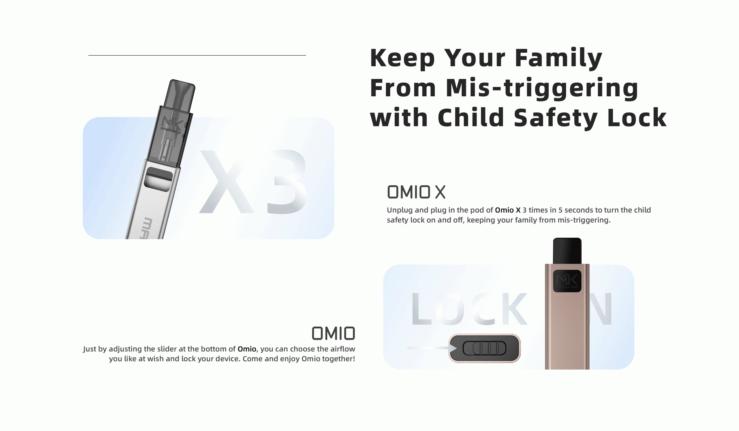 In contrast, the Omio X features a flatter, slimmer profile at 100mm x 22mm x 12mm, and is more lightweight due to its smaller battery and e-liquid capacity. It uses a manual start mode, which may appeal to users who prefer a bit more control. Though it’s lighter, it still maintains a modern, colorful design aimed at younger adult vapers.