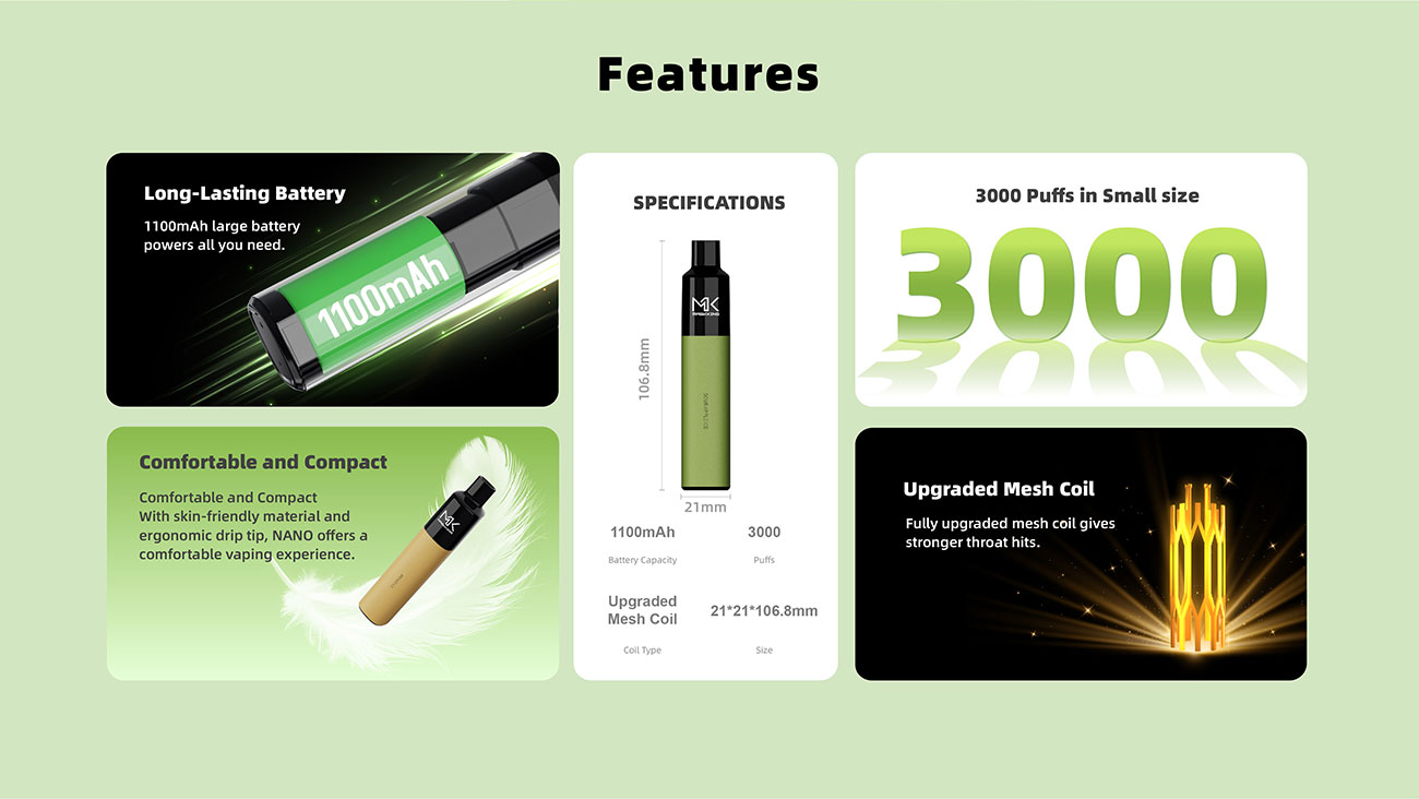 The Maskking Nano 3000 boasts a sleek cylindrical design with dimensions of 28mm by 104.5mm, making it slightly thicker but still very portable. With a sturdy 64g weight and stylish build, it feels solid in the hand while remaining easy to carry. It’s draw-activated, eliminating the need for buttons or settings—perfect for hassle-free vaping.