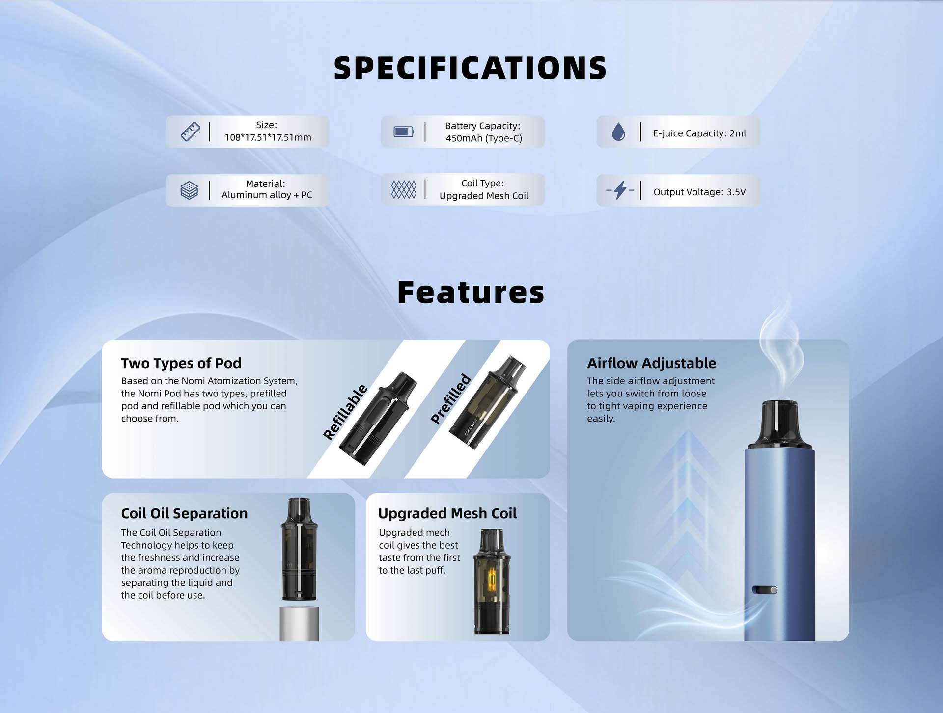 The Maskking Nomi Air is equipped with a 450mAh battery and a 2ml pod capacity, providing ample power and juice for extended vaping sessions. It features a cable-based charging system and a sensor-activated draw, ensuring a seamless and hassle-free experience.