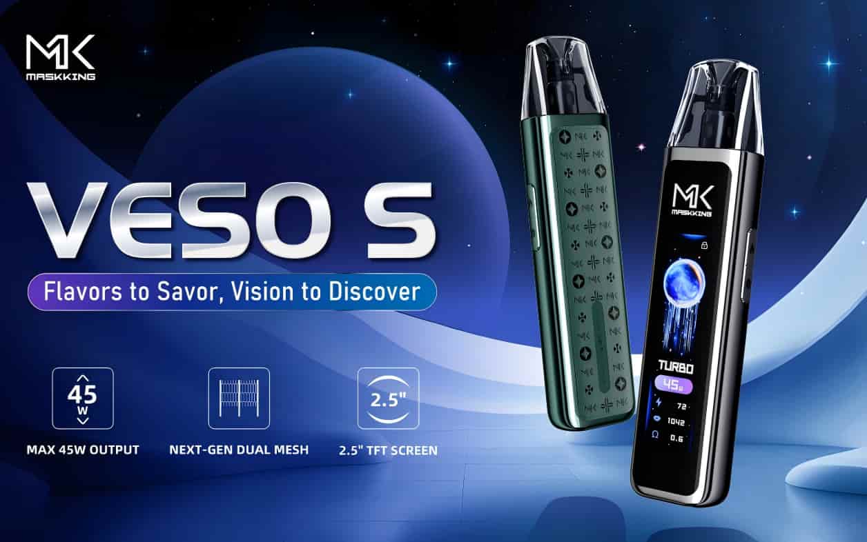 As a new member of the VESO Series family, the VESO S adopts a sleek, elongated body, combines high-end aesthetics with groundbreaking intelligence, featuring a 2.5-inch TFT smart display, an intelligent operating system, and up to 45W of output, the VESO S represents Maskking’s vision for the new generation of open-pod systems.
