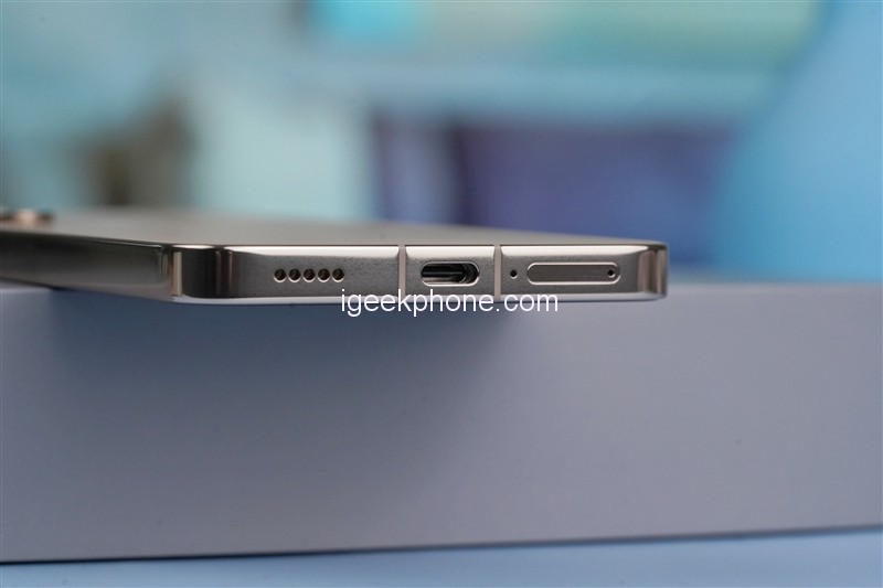 The bottom of the phone has a speaker opening, the Type-C and earphone two-in-one interface is located in the bottom center, and the right side is the primary microphone and SIM card slot.