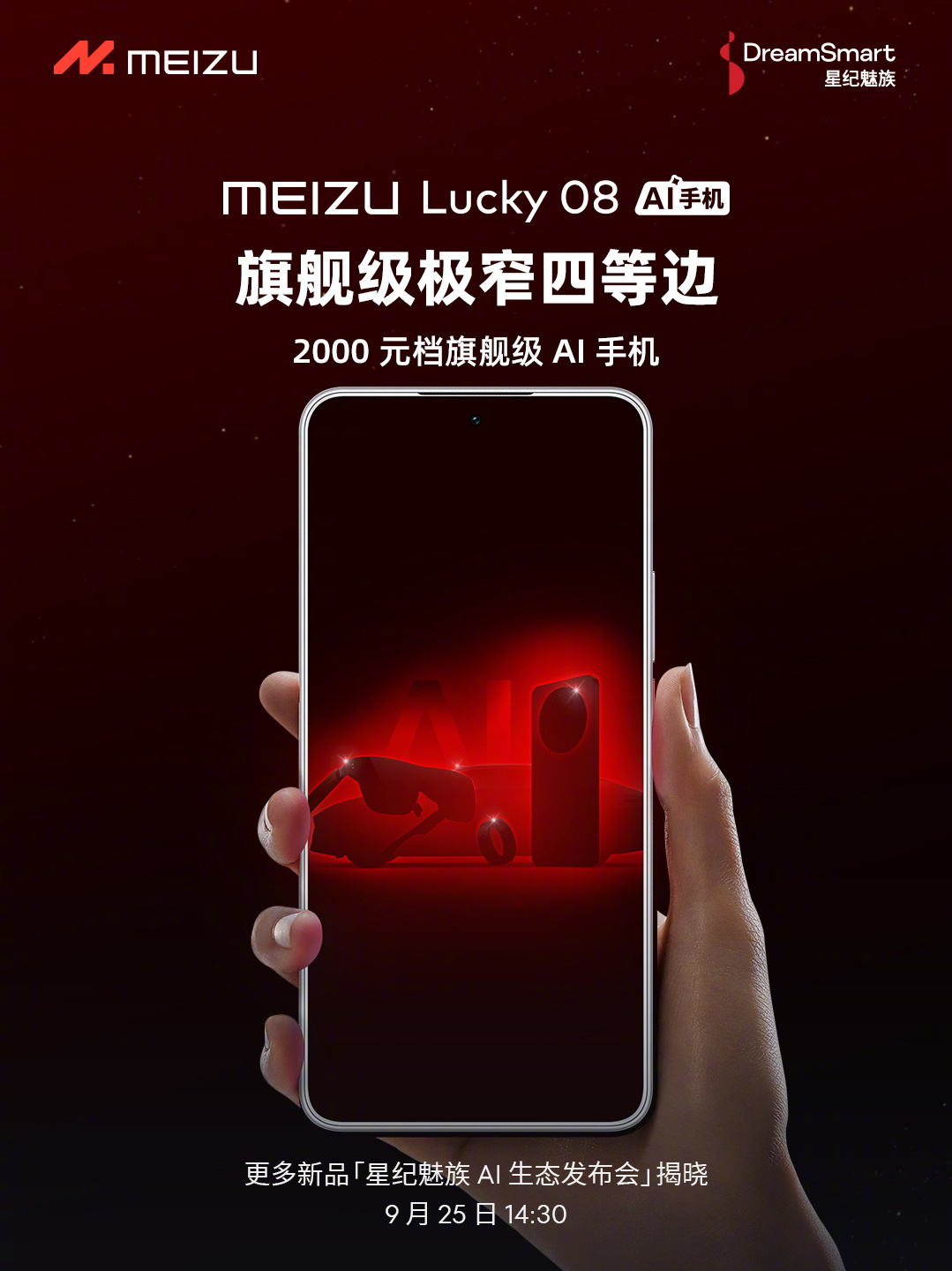 In addition, Meizu Lucky08 mobile phone design details have also been announced, the machine positioning “2000 yuan file flagship AI mobile phone”, using 1.75mm extremely narrow quadrilateral, front and rear double 2.5D micro arc design, the use of G3 curvature connection. The phone has two colors, black and white, both use the red power key color contrast design.