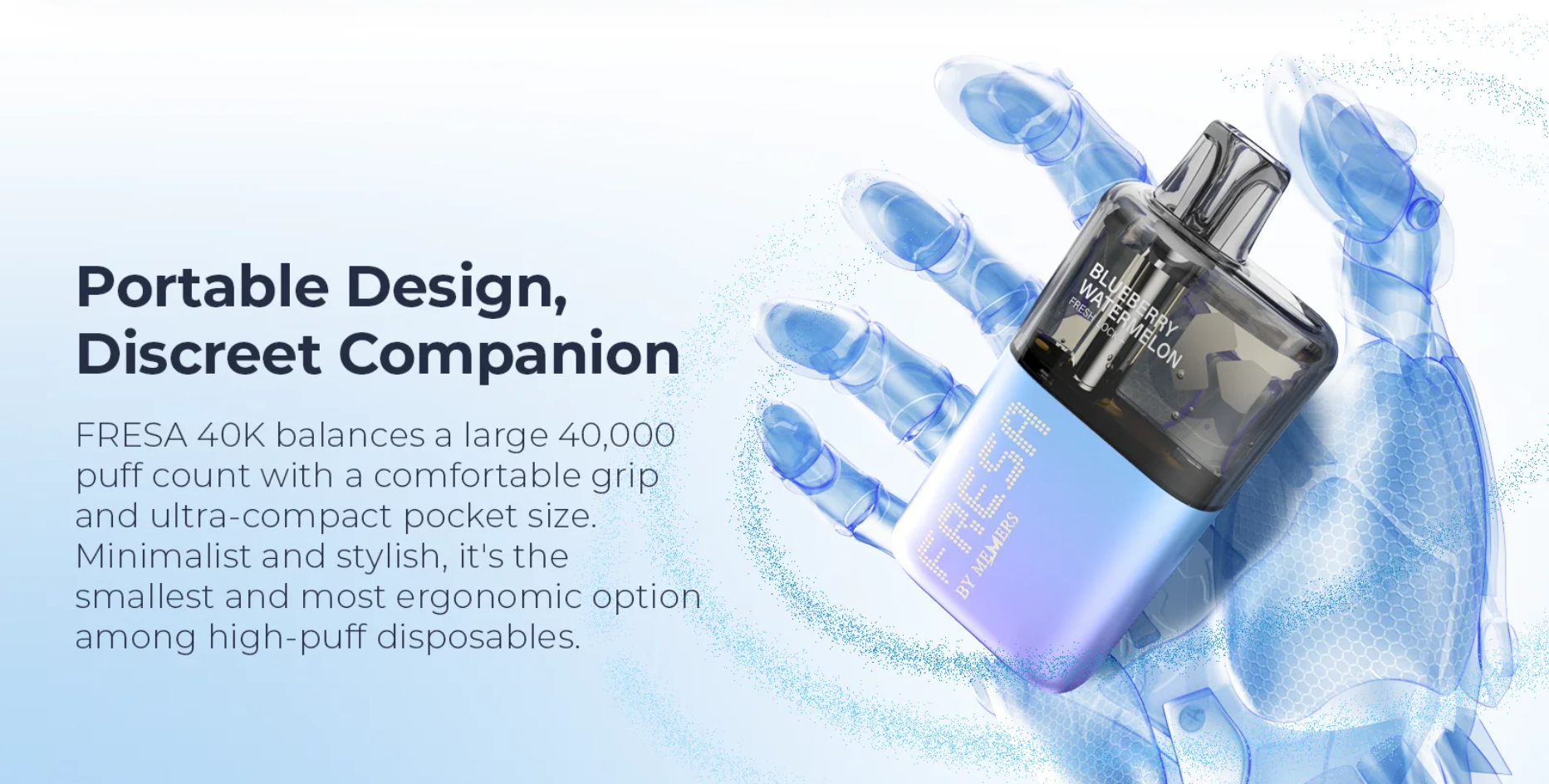The FRESA 40K focuses on freshness and efficiency rather than capacity alone. It delivers up to 40,000 puffs using a 900 mAh rechargeable battery, dual mesh coil, and 20 mg (2%) nicotine strength.