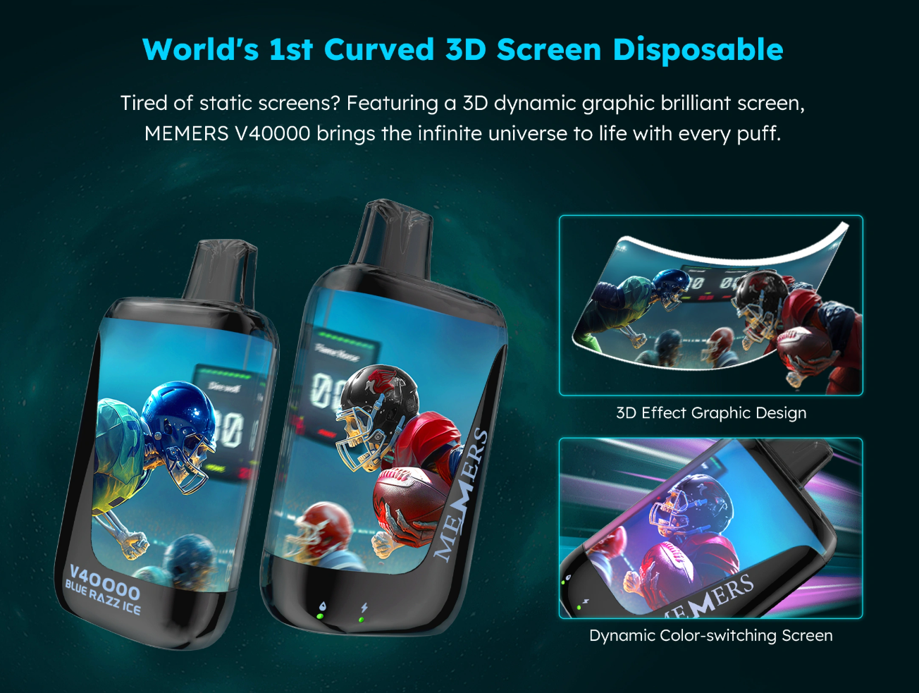 Memers V40000 features a sleek body paired with a 3D curved graphic display. This screen shows battery life, e-liquid level, and animated visuals that change color during use—making it ideal for users who like a modern, tech-forward look. The device is fully disposable, so once the battery and e-liquid are depleted, it’s ready to be replaced.