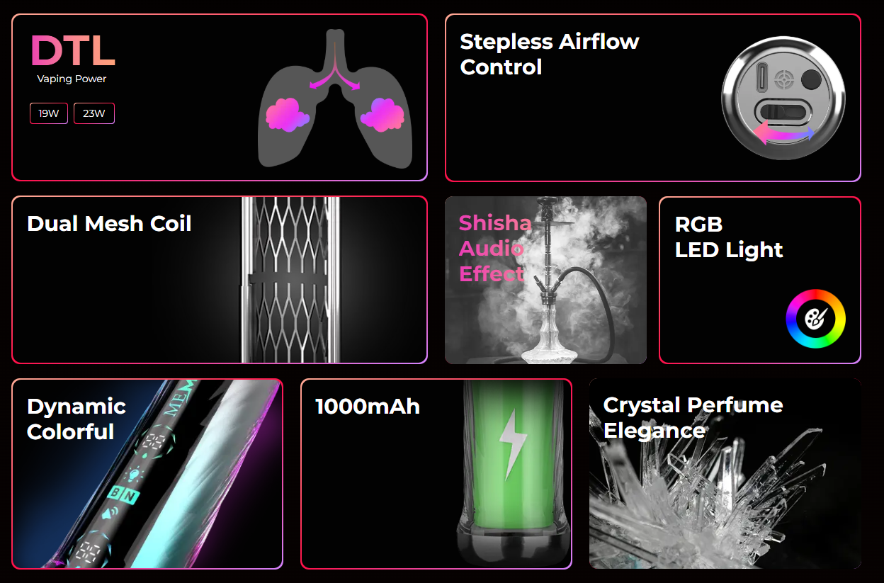 Memers Wukong V20000 brings direct-to-lung (DTL) vaping to the forefront with dual mesh coils and adjustable power output, switching between 19W and 23W via “N” and “B” modes. Its MITS platform promises ultra-smooth vapor delivery, especially when paired with stepless airflow control. You also get immersive shisha-style audio effects and a vibrant color screen that keeps you updated on puff count, battery, RGB, and even audio settings.