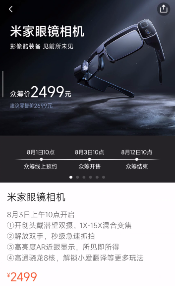Today, Xiaomi Mall announced that the MiJia Glasses camera officially launched, and will open crowdfunding at 10 o ‘clock on August 3. The retail price of the product will be 2,699 yuan,$402, and the price will be 2,499 yuan, $372 during the crowdfunding period, with a limited amount of sunglasses worth 299 yuan, $44.