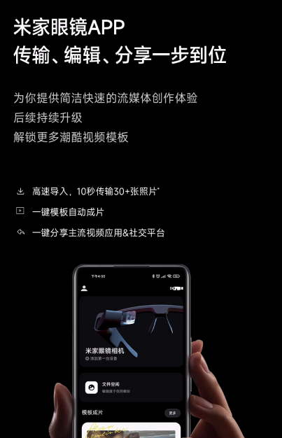 In addition, as a product of Mijia ecology, Mijia Glasses camera can also be connected with mobile phone through App, so as to realize rapid photo import, one-click template formation, one-click sharing and other functions.