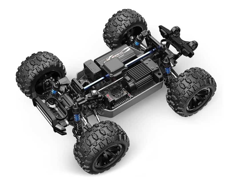 • Metal & High-Strength Materials: Key stress points are reinforced with aluminum oil-filled shocks, metal drivetrain components (differential gears, dog bones), and a nylon fiber composite frame. This blend of materials provides fantastic impact resistance and a stable, planted ride.