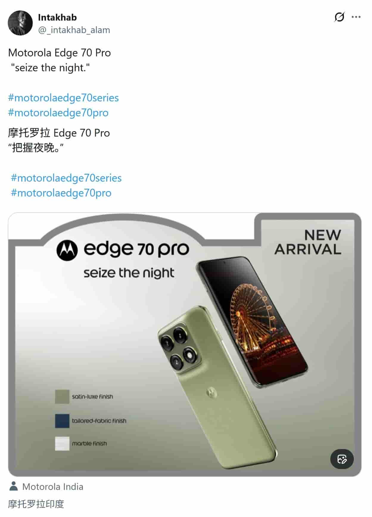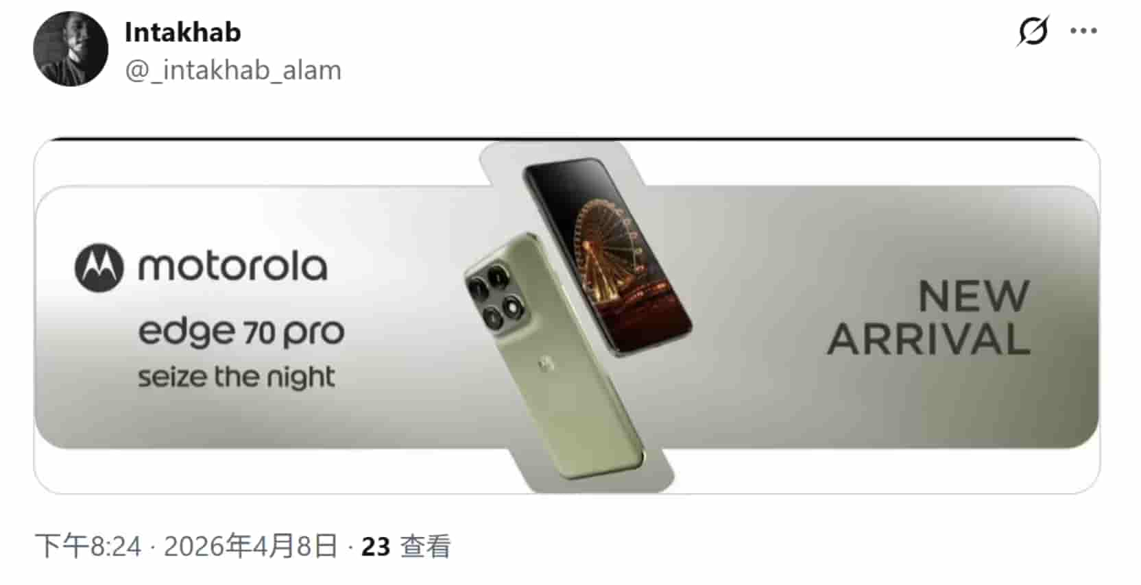Igeekphone reported on April 9th that the source @_intakhab_alam posted a tweet on the X platform today (April 8th), sharing a set of promotional materials featuring the Motorola Edge 70 Pro smartphone.