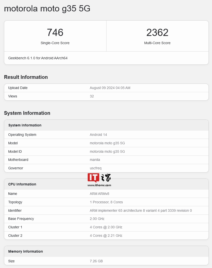 The Moto G35 5G phone is equipped with 8GB of memory, Android 14 and an eight-core processor, of which four core frequencies are 2.00GHz and four core frequencies are 2.21GHz, which should be the purple light T760 chip.