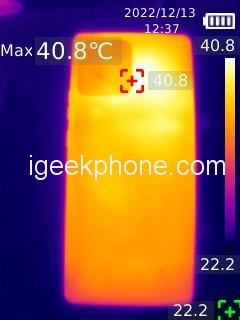 We use an infrared thermometer to see how well the heat is dissipating on the back of the phone. The author turned on the high-performance mode and ran “Yuan Shen” for 15 minutes at a room temperature of 22 degrees Celsius. The core area of the second-generation Snapdragon 8 is only 40.8 degrees Celsius. , just around the heating area, the hand feels only warm, not hot.