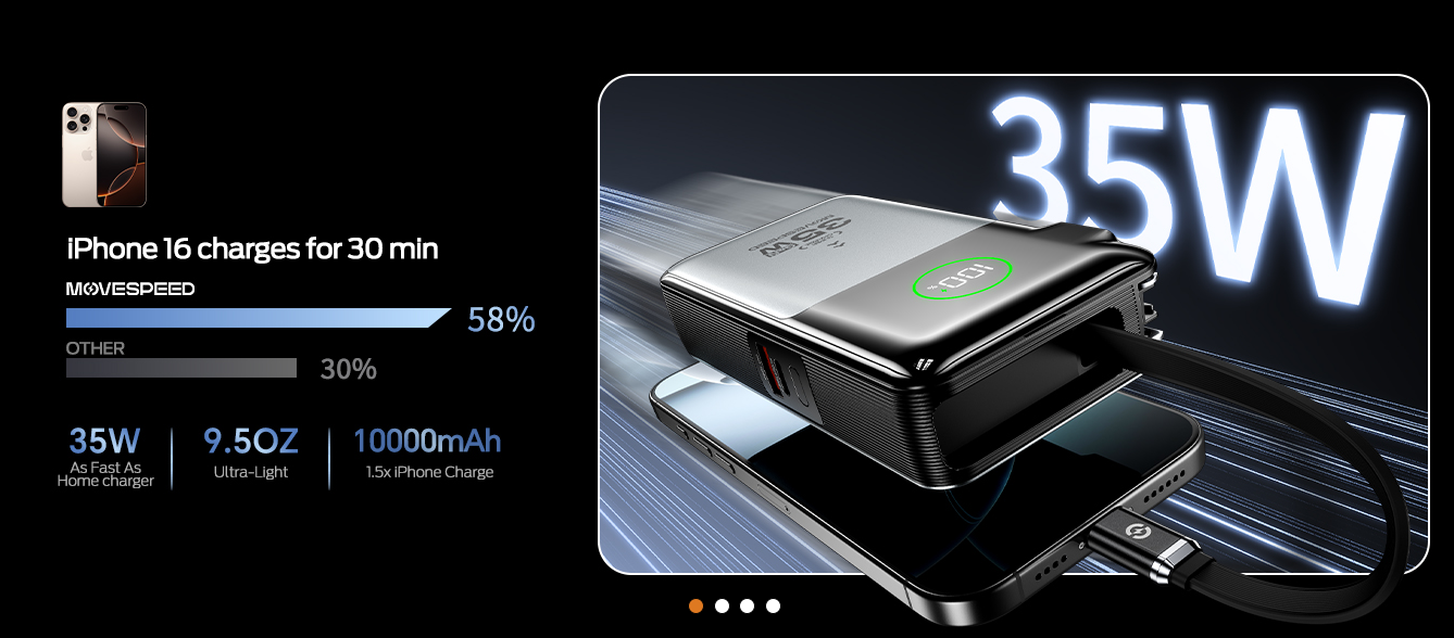 Under the hood, this charger is as powerful as it is practical. The 10,000mAh battery capacity gives you enough juice to fully recharge an iPhone 16 up to 2.2 times. Thanks to advanced GaN technology, you’ll also enjoy 35W ultra-fast charging—bringing an iPhone from 0 to 58% in just 30 minutes. The real-time digital display is another standout, letting you check the exact battery percentage and charging status at a glance. No more guessing how much power you have left.