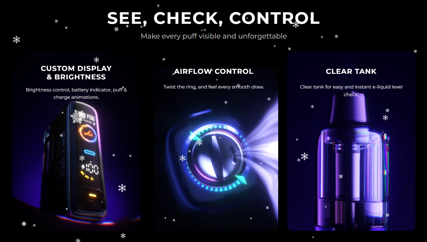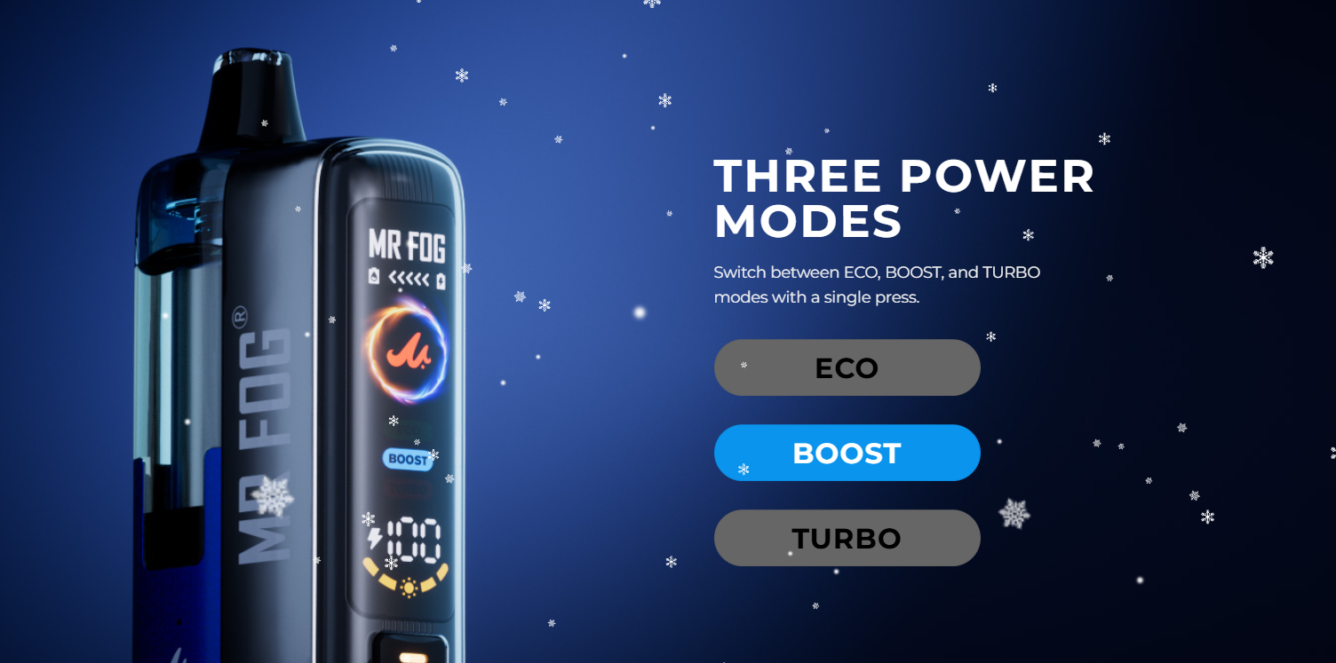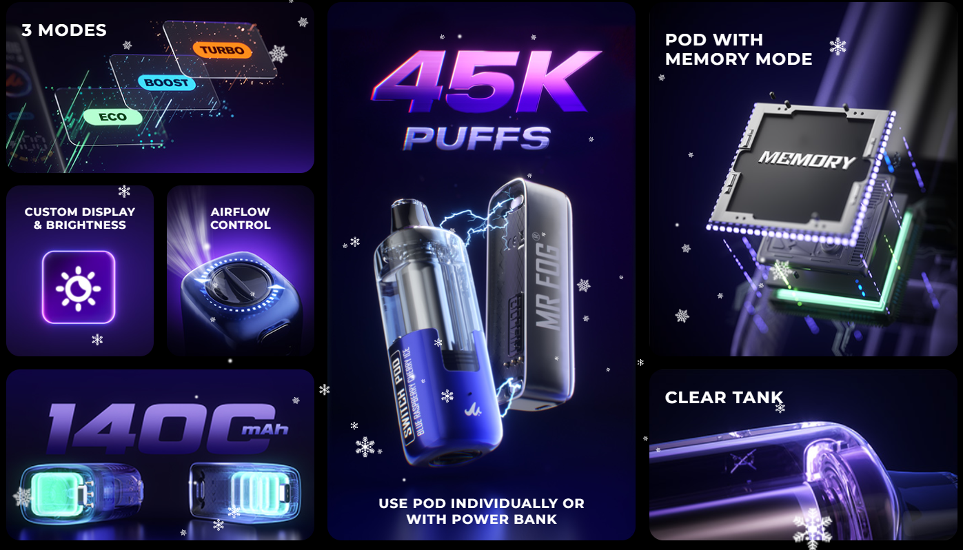 The MRFOG SWITCH POD focuses on flexibility and modular design. It can be used as a standalone pod or connected to the SWITCH power bank, instantly extending performance up to an impressive 45,000 puffs. The clear tank design adds practicality, allowing quick e-liquid checks, while the custom display with adjustable brightness gives it a modern, tech-forward look.