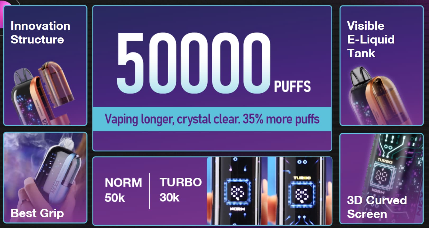 - 50,000 puff capacity in NORM mode, or kick it into Turbo mode for 30,000 puffs with even more intensity.