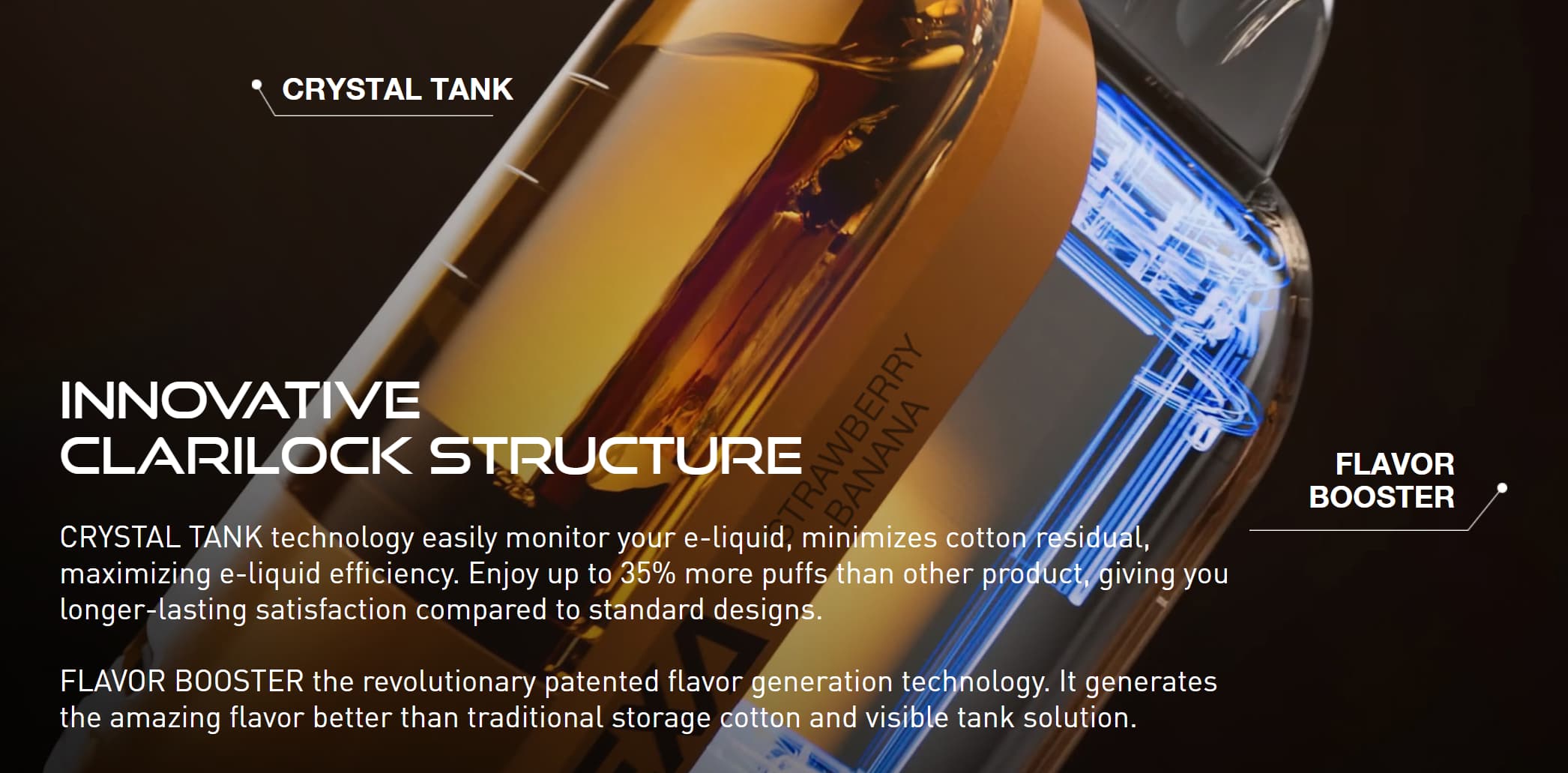 And thanks to the Crystal Tank technology and ClariLock structure, you’ll always know how much juice you’ve got left while minimizing residue and maximizing e-liquid efficiency, giving you up to 35% more puffs compared to standard disposable vapes.