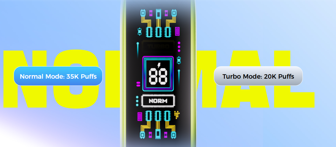 And then there’s Dual Mode operation. In Normal Mode, the device is calibrated for maximum longevity, promising up to 35,000 puffs. Switch to Turbo Mode—ideal for heavier vapers or those craving bigger clouds—and you can still achieve up to 20,000 puffs. Both modes are clearly displayed on the HD screen, along with real-time battery status courtesy of the 800 mAh internal cell. When it’s time to recharge, the Type-C port delivers fast charging, so you’re not tethered to the wall for hours.