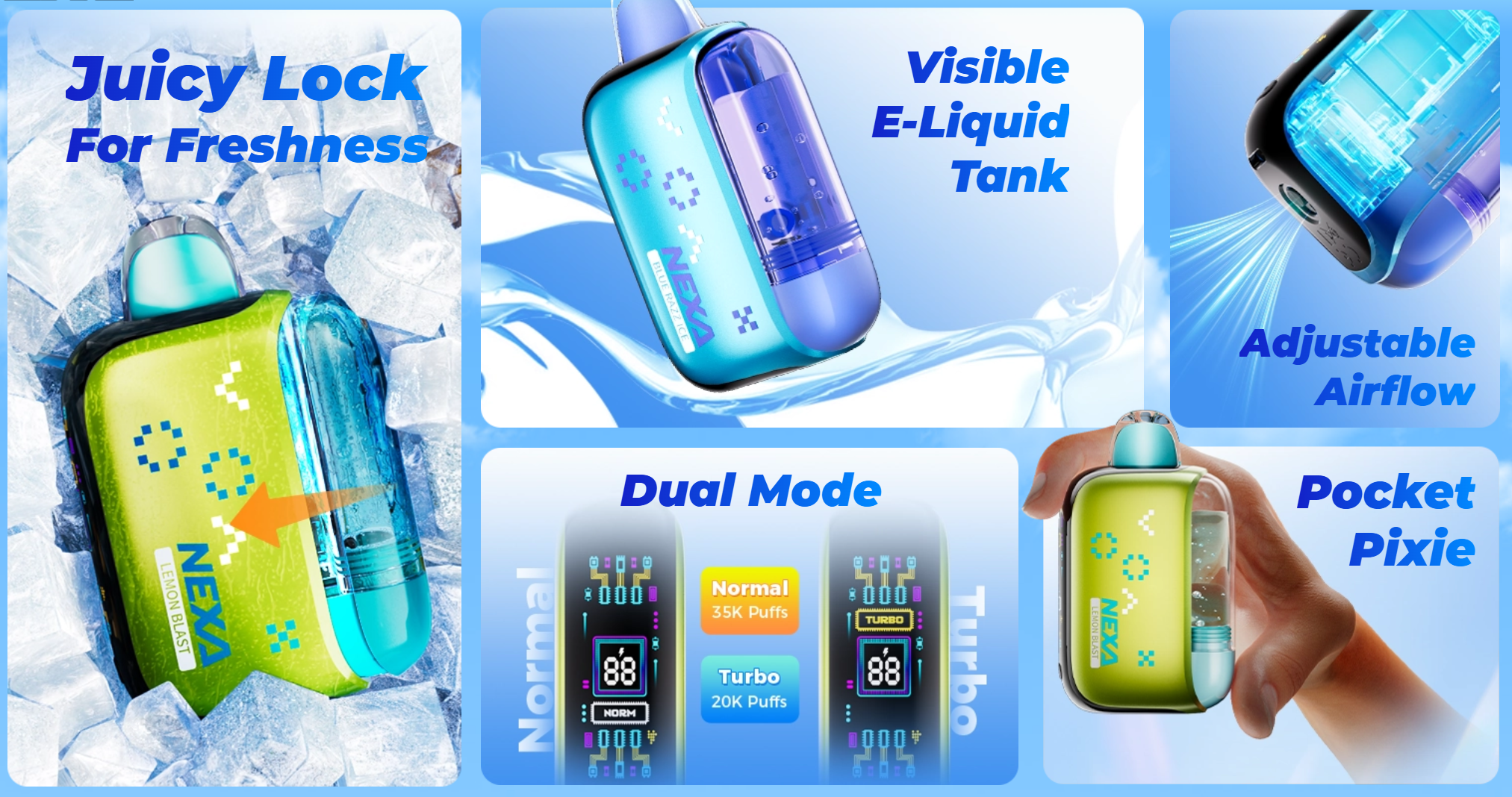 On the flip side, the NEXA PIX takes a more subtle, yet functional approach. Nicknamed the “Pocket Pixie,” it’s small enough to fit in the palm, yet it doesn’t skimp on features. You still get a sharp display and even a dual-mode system (Normal for 35K puffs, Turbo for 20K), packed into a surprisingly compact form. It may not light up the room, but it fits in any pocket with ease and looks sleek doing it.