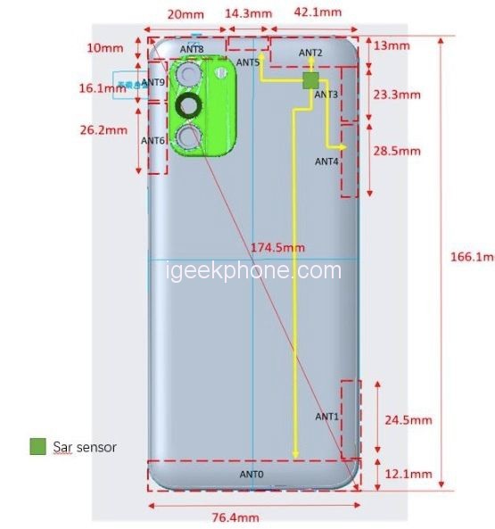In other respects, the FCC database also shows that the phone is equipped with an LCD screen, the rear three cameras include a 48MP main camera, a 5MP ultra-wide-angle and a 2MP depth of field lens, and a front 16MP lens, the phone is 76.4 mm wide and 166.1 mm high.