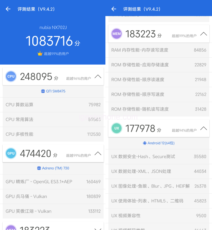 The AnTuTu comprehensive performance test scored 1,083,716 points. Nubia does not have a global performance model. The scheduling of the running points is very conservative. Compared with the previous generation equipped with Snapdragon 8, the score of 950,000 points has improved significantly.
