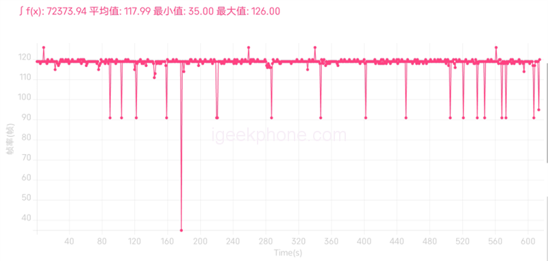 “Honor of Kings” supports 120-frame mode, with an average frame rate of 117.99 FPS. Except for the frame drop caused by the middle screen cut, the whole frame rate can be said to be very stable.
