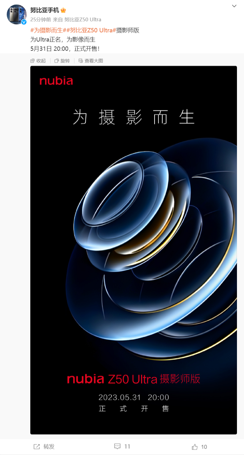 According to Nubia’s official Weibo account, Nubia Z50 Ultra Photographer Edition will officially go on sale at 20:00 on May 31, and the poster shows that the device will feature images.