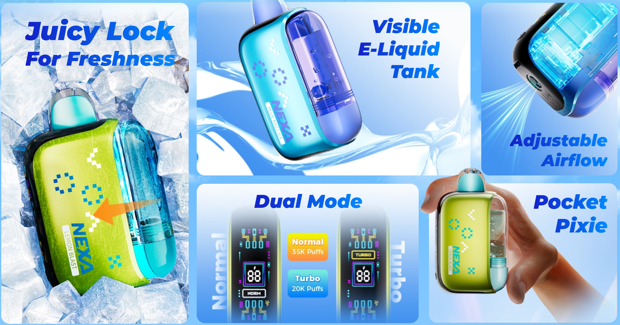 Meanwhile, NEXA PIX counters with a Dual Mode system—Normal Mode for 35K puffs and Turbo Mode for thicker clouds at the cost of lower puff count (~20K). It also features adjustable airflow, a visible crystal e-liquid tank, and the Juicy Lock mechanism that keeps flavor fresher longer. It’s less about raw power and more about flavor purity, visibility, and consistent output.