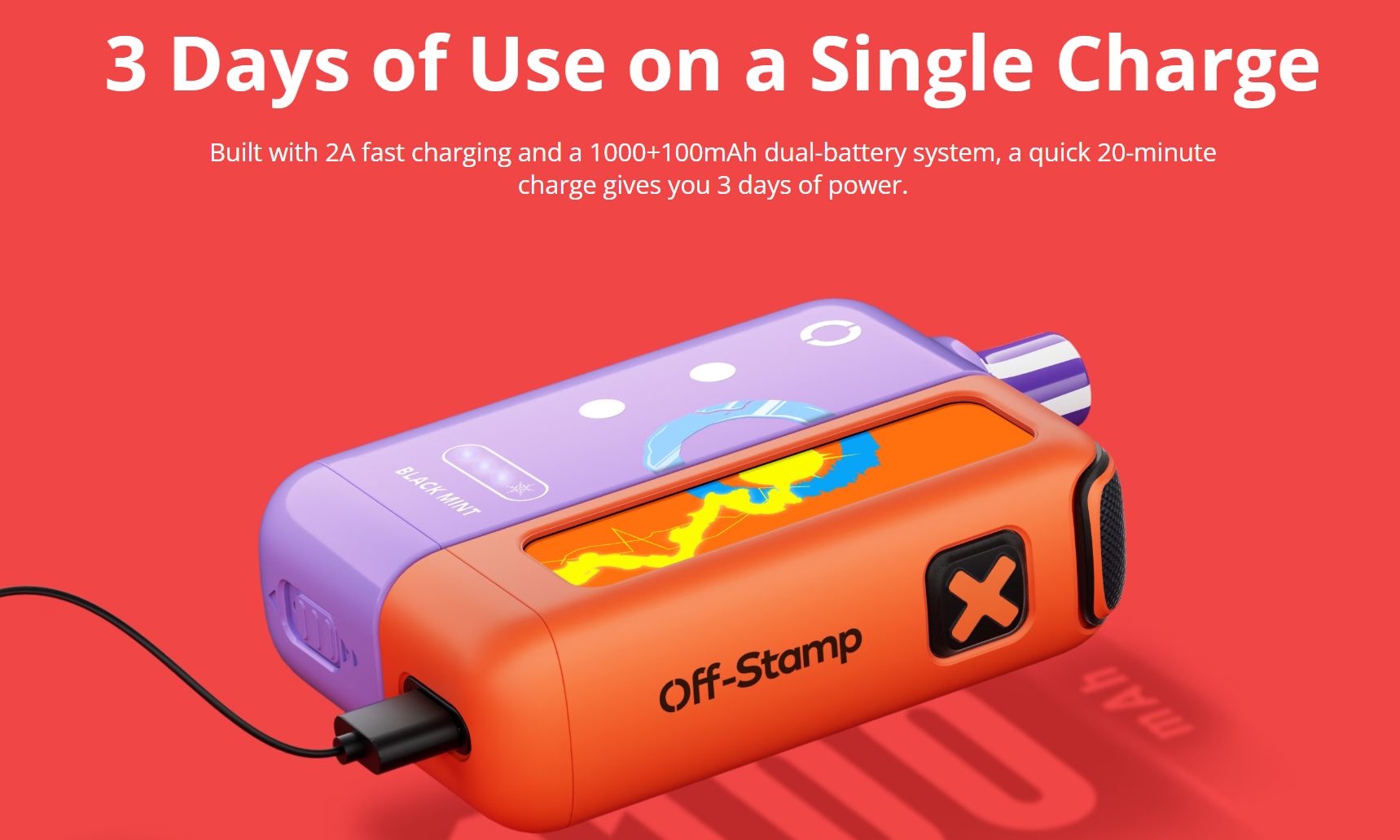 When it comes to performance, Off-Stamp X Cube goes hard. Thanks to the replaceable 1100mAh battery system and fast Type-C charging (full charge in just 20 minutes), it can go strong for up to 3 days on one dock cycle. Plus, the draw-activated firing and mesh coils ensure every puff hits right.