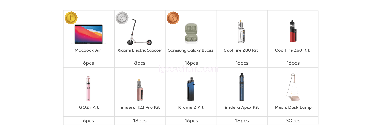Note: The prizes to be won include; MacBook Air, Xiaomi Electric Scooter, Samsung Galaxy Buds 2, Coolfire Z80 Kit, Coolfire Z60 Kit, GOZ+ Kit, Endura T22 Pro Kit, Kroma Z Kit, Andura Apex Kit, and up to 30 pieces of Music Desk Lamp.