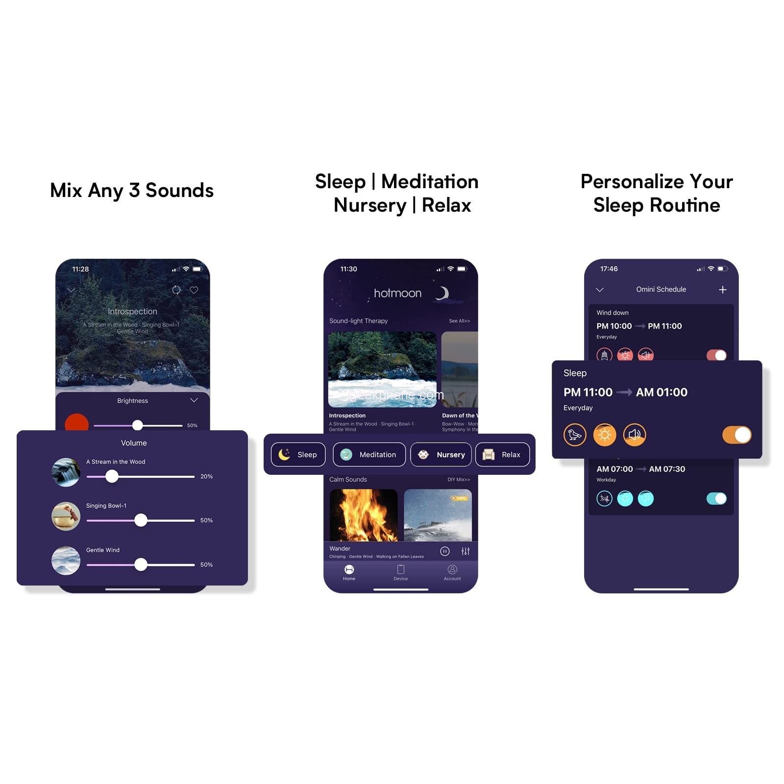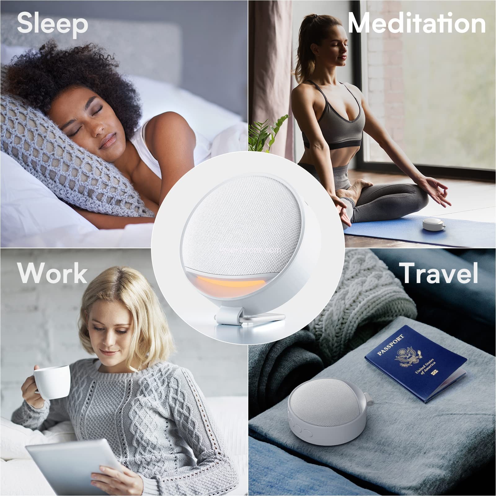 The OMINI Smart Portable Sound Machine is a three-source hybrid sleep sound machine; that offers 40+ sound and light therapies for a relaxing and comfortable sleep. With the ability to customize any scene and atmosphere; this machine provides various options such as white noise, brown noise, pink noise, fan, brook; rain, alpha waves, ocean, bird, and bonfire sounds. The breathing lights in the device aid in meditation and relaxation; while the DIY breathing lights allow for a unique and soothing sleep experience.