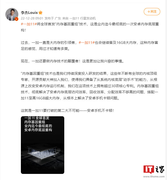 OnePlus 11 will be officially released on January 4th. Following yesterday’s announcement of the global launch of “gaming cloud computing private network” technology for the new phone, today the official announcement of a global launch technology for the new phone – “memory gene reorganization” technology.