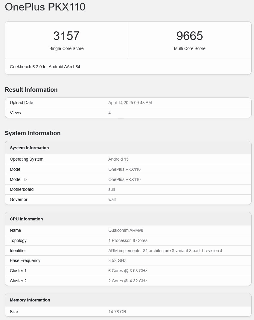 Igeekphone April 15 news, science and technology media xpertpick published a blog post yesterday (April 14), reported that the One plus 13T mobile phone appeared in the GeekBench running library, equipped with Qualcomm Snapdragon 8 supreme version chip and 16GB memory, 6.2.0 single-core 3157 points, Multicore 9665 points.