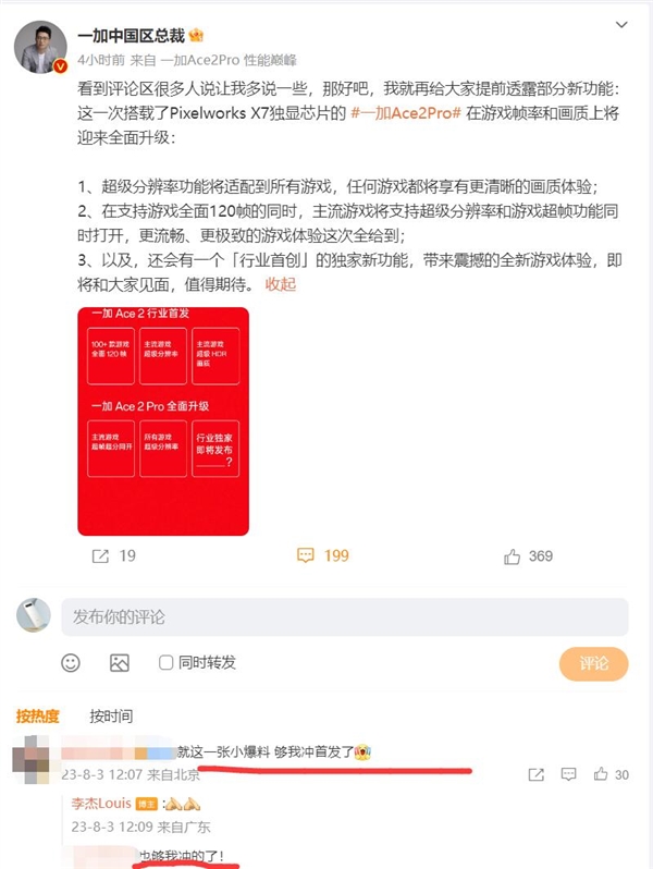 igeekphone on August 3, Li Jie, president of OnePlus China, warmed up the Ace 2 Pro. Li Jie said that the OnePlus Ace 2 Pro is equipped with Pixelworks X7 unique display chip, which will usher in a comprehensive upgrade in game frame rate and picture quality: