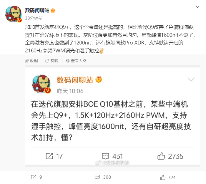 According to blogger @digital chat station, Q9 + compared to the previous generation Q9 improved color bias and shadow, improved performance in dark light environments, gray transition is more natural and even. The local peak is 1600nit, the global excitation brightness is also 1200nit, and the flagship Pro XDR supports 2160Hz high frequency PWM dimming and wet hand touch by default.
