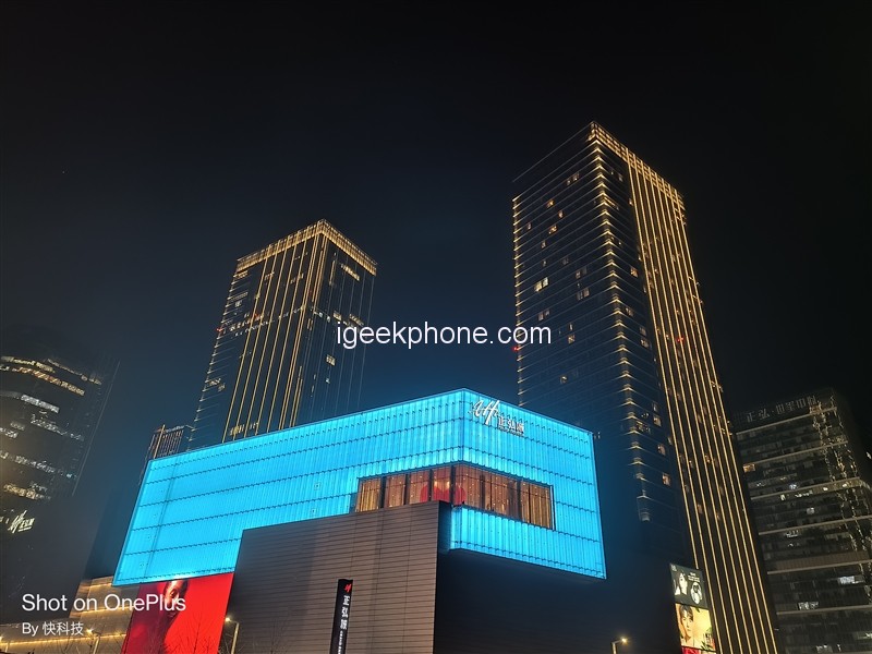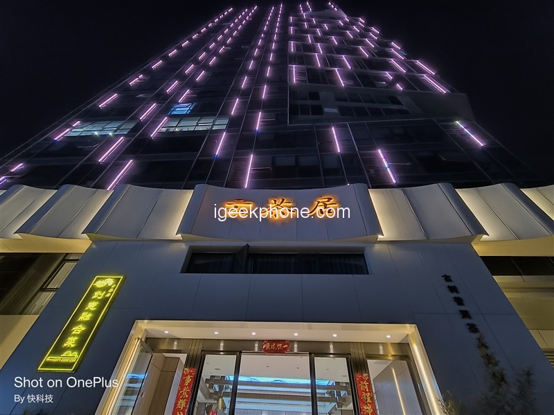 In the night scene, in the environment of mixed colors, using the long exposure of the night mode, the highlights of the light sign are well suppressed, the texture details of the light sign can be seen clearly, and there will be no excessive light rendering problems, especially the display of the following two monochrome buildings, making the overall picture look particularly transparent.