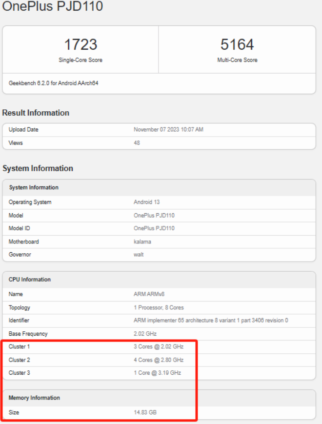 According to Igeekphone previously reported that last week, a new model of PJD110 appeared in Geekbench running platform, equipped with Snapdragon 8 Gen 2 processor, is expected to be a OnePlus Ace 3 phone. In Geekbench6.2.0, this test machine achieved 1723 points for single-core and 5164 points for multi-core. The processor CPU is composed of 1 3.19GHz core, 4 2.80GHz core and 3 2.02GHz core. It runs the Android 13 operating system and has 16GB of RAM.