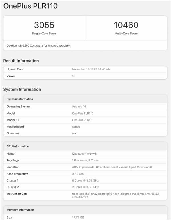 On November 19th, Igeekphone reported that recently, the benchmark score of a new OnePlus device with the model number “PLR110” appeared in the Geekbench database. The blogger “Digital Chat Station” revealed that this device is the OnePlus Ace 6T, which is also the first benchmark score of Qualcomm’s fifth-generation Snapdragon 8.