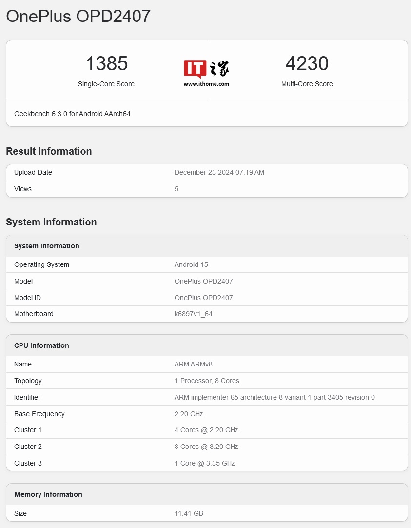 Igeekphone December 24 news, the model of “OPD2407” oneplus tablet appeared in the GeekBench running library, 6.3.0 version single-core score of 1,385 points, multi-core score of 4,230 points.