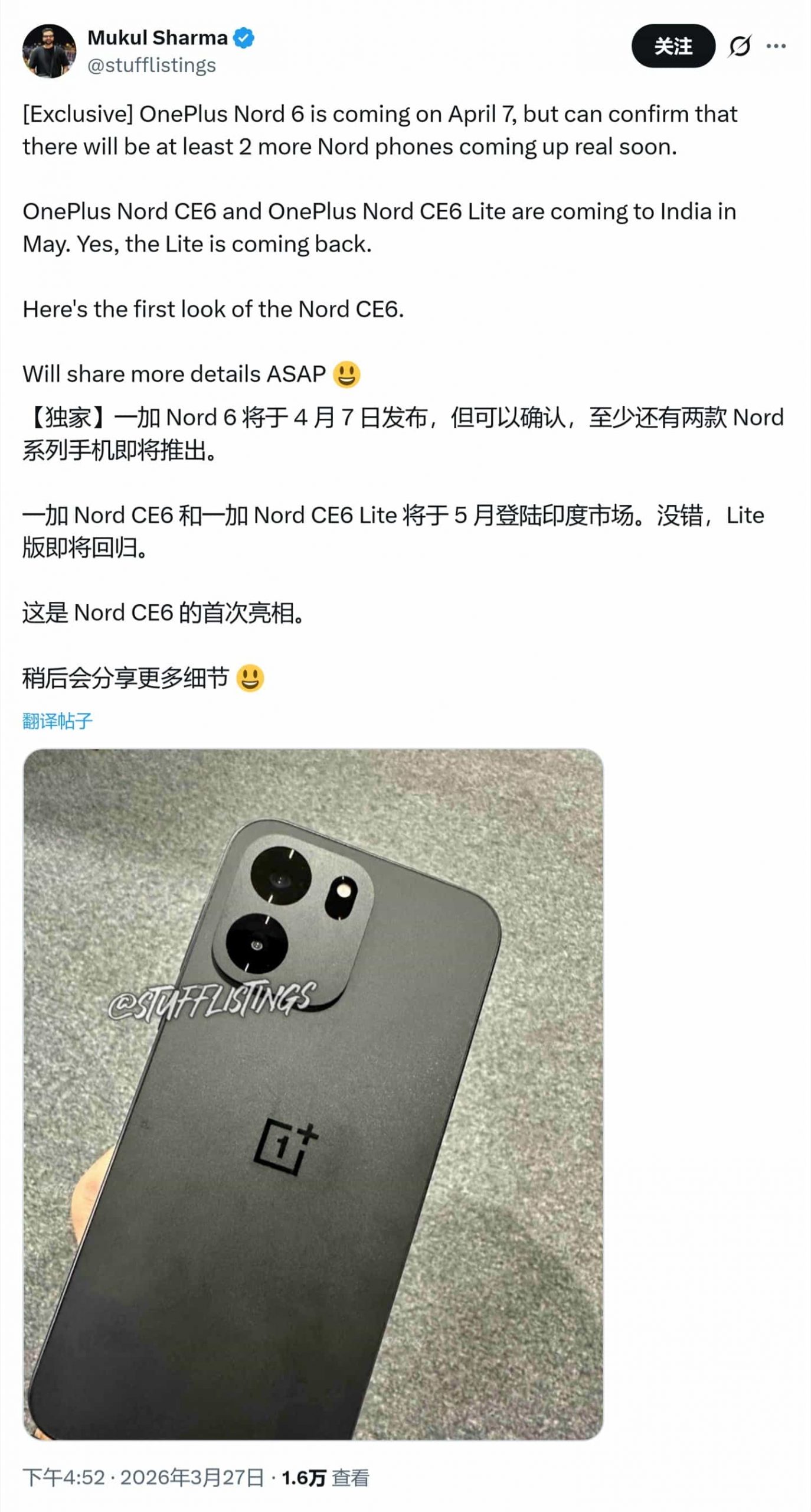 Igeekphone reported on March 28th that the source @stufflistings posted a tweet on the X platform yesterday (March 27th), sharing the real photos of OnePlus Nord CE 6. This phone is expected to be released in May this year.