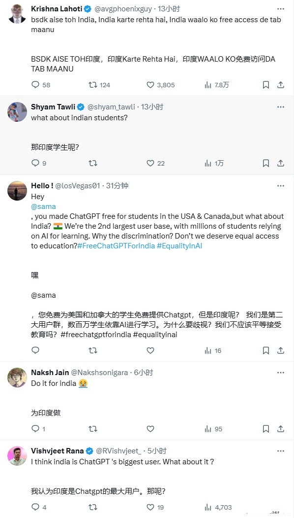 It is worth mentioning that there are a large number of Indian users complaining about injustice under his X article, hoping that OpenAI can do the same, but Altman did not respond.